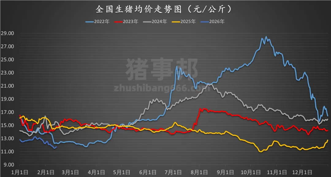 据猪事邦平台汇总的数据,2月13日全国生猪均价为11.73元/公斤,较昨日上涨1.36%,同比下跌19.99%(去年同期全国生猪均价14.66元/公斤)。