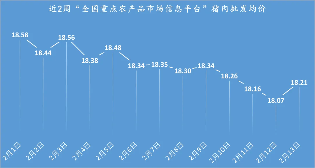 据农业农村部“全国重点农产品市场信息平台”监测数据,2月13日全国农产品批发市场猪肉平均价格为18.21元/公斤,较昨日上涨0.8%,同比下跌17.4%(去年同期猪肉批发价格22.04元/公斤)。