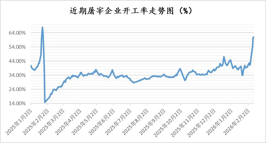 信息分享 农业农村部“全国重点农产品市场信息平台”监测数据 ,2026年2月11日全国屠宰企业开工率为61.08%,较上一个统计日上涨0.74个百分点(2026年2月10日全国屠宰企业开工率为60.34%)
