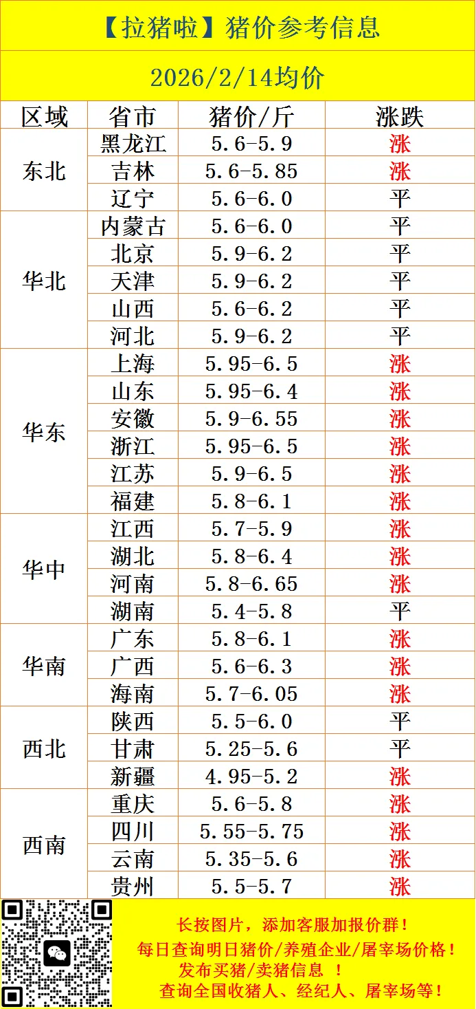 【拉猪啦】2.14-猪价行情与买卖猪信息!(看涨情绪增加,多地上涨!)