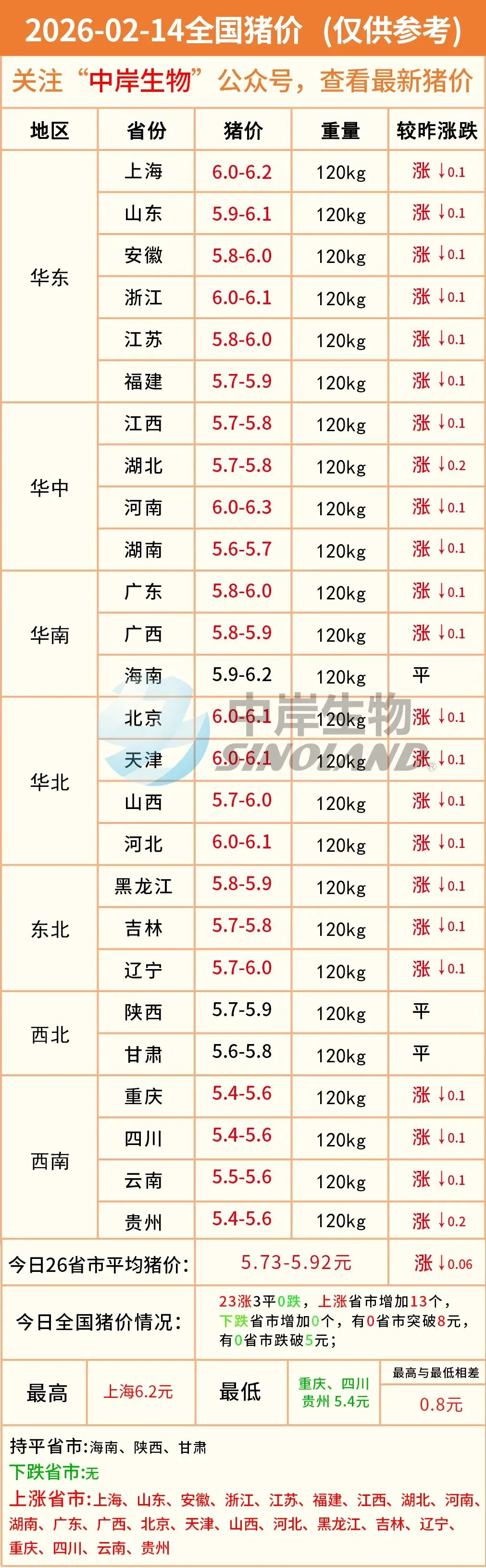 明日猪价|2026-02-14全国最新猪价(猪价已更新!) 养羊网 2026-02-13 明日猪价|2026-02-14全国最新猪价(猪价已更新!)营销中心丨0731-83806009技术服务丨0731-83806019 养羊网 2026-02-13 上一篇:2026年2月14日猪价行情观点和操作建议 下一篇:2026.2.14鸡蛋价格早报 您可能还会对下面的文章感兴趣111: 相关文章 1月31日广西鸡蛋价格参考,跌 农村粮食喂养黑猪 在羌牧源每只羊都有自己的名字 2025年4月13日全国各地生猪价格信息