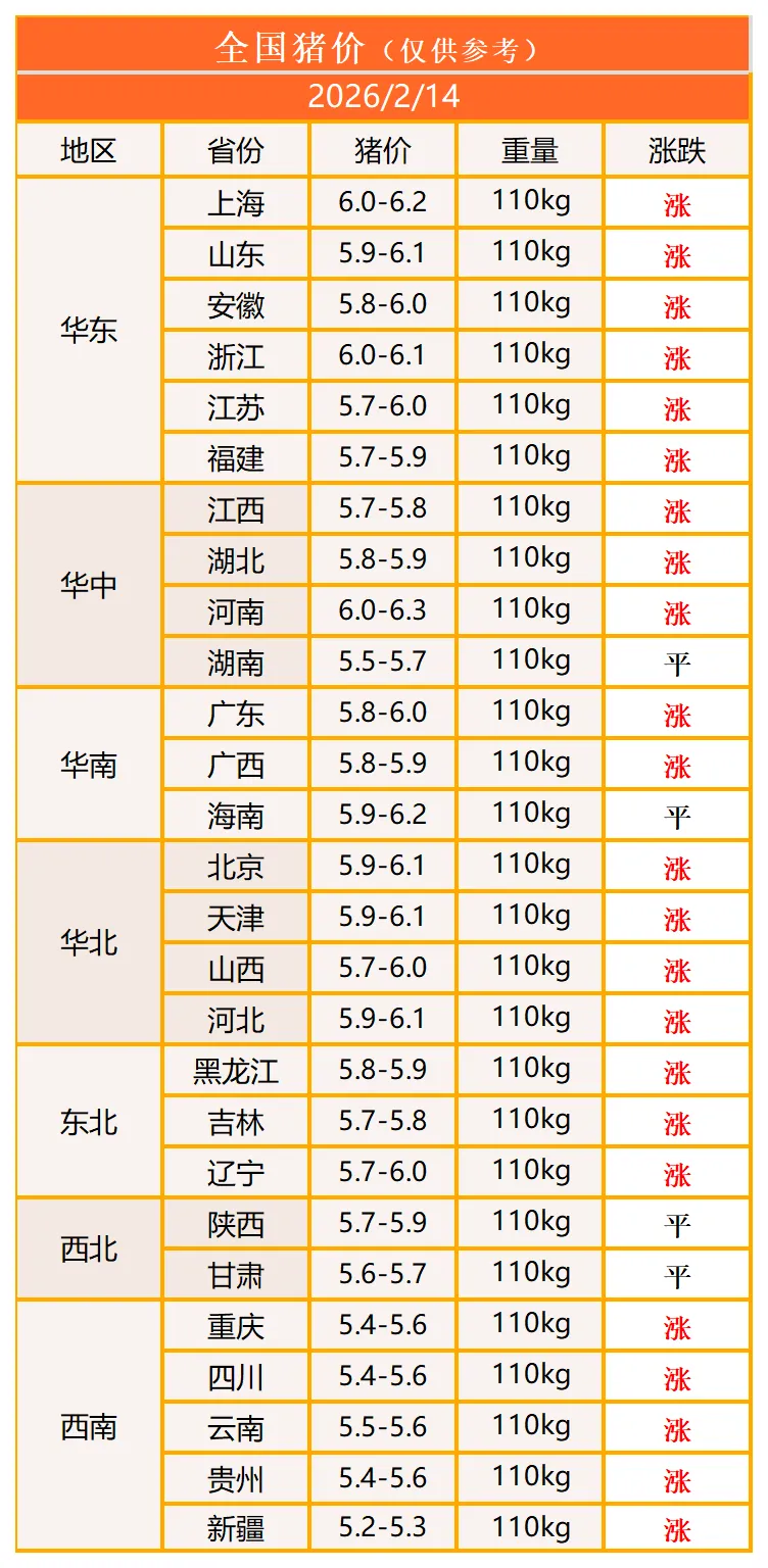 明日猪价2026年2月14日猪价信息 养羊网 2026-02-13 明日猪价2026年2月14日猪价信息图中二维码 >添加关注领异标新 鲜声夺人多用心 同分享长按指纹 >识别 养羊网 2026-02-13 上一篇:明日猪价 | 2026.2.14日~全国各地最新猪价(猪价一片红) 下一篇:价格暴涨!很多人爱吃,网友:鸡蛋快配不上它了 您可能还会对下面的文章感兴趣111: 相关文章 近期价格更新!!! 新鲜鸡蛋送到你手上! 生猪还不涨 本周我省猪肉鸡蛋价格上涨
