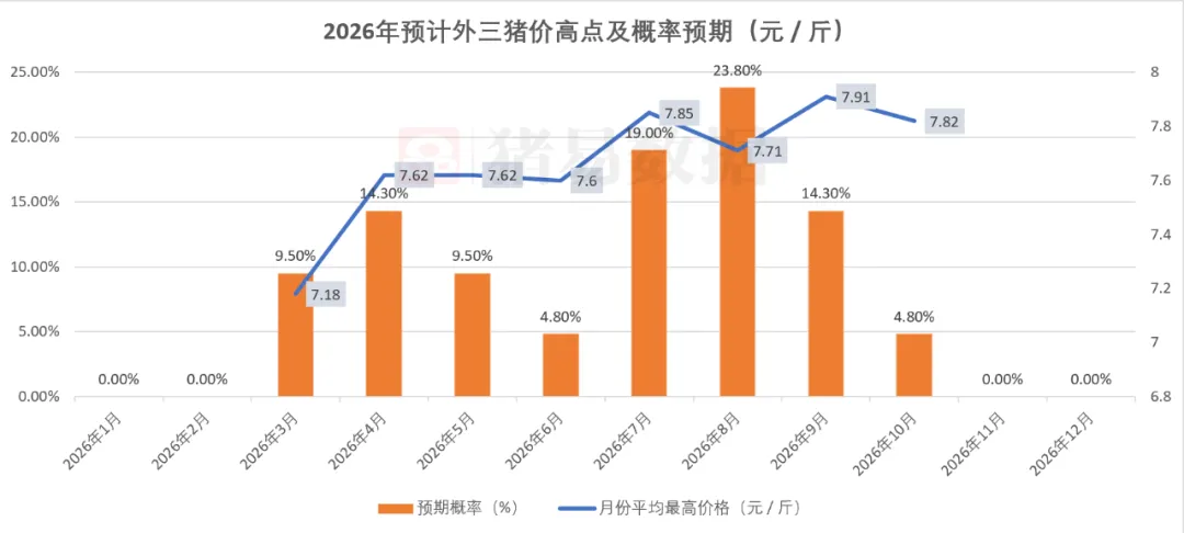 2026年生猪外三均价预期,7-8月预期最高,价格预期在7.7-7.8左右,其中7月预期最高,占总人数的23.8%。