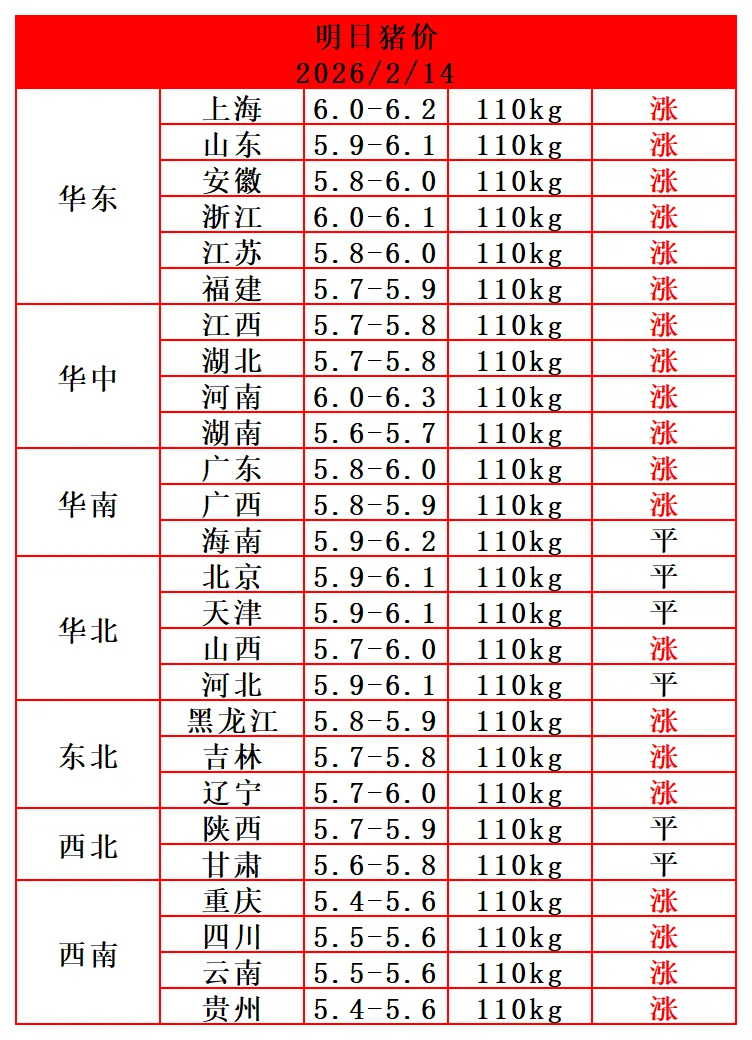 2026-2-14日猪价(明日猪价) 养羊网 2026-02-13 2026-2-14日猪价(明日猪价)立马收到明日猪价! 养羊网 2026-02-13 上一篇:【今日猪价】2月13日 全国猪价 下一篇:2026.2.13全国鸡蛋价格最新报价行情参考,2.13鸡蛋价格今日价全国走势 您可能还会对下面的文章感兴趣111: 相关文章 河南·南阳硕宝合作社鸡蛋价格[2026年1月27日] 生猪暴涨,姐又接住了这波富贵 近期价格更新!!! 1-24-全国鸡蛋价格