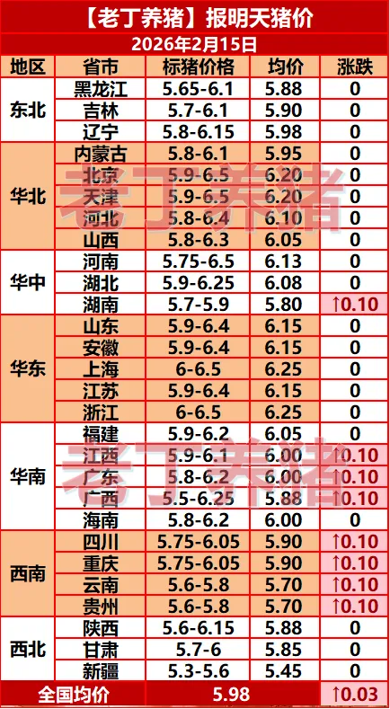 猪价有涨!【明天猪价】2月15日全国猪价涨跌表!关注老丁养猪