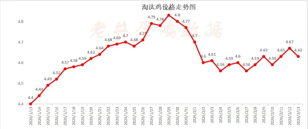 昨日,淘汰鸡均价4.63元/斤,较前日减0.04元/斤,减幅0.86%!受春节后蛋价季节性下跌因素影响,目前淘鸡市场货源稍增,不过仍有部分计划换羽,随着春节假期来临,屠宰企业停工率较高,农贸市场需求尚可,淘鸡市场购销基本平衡。