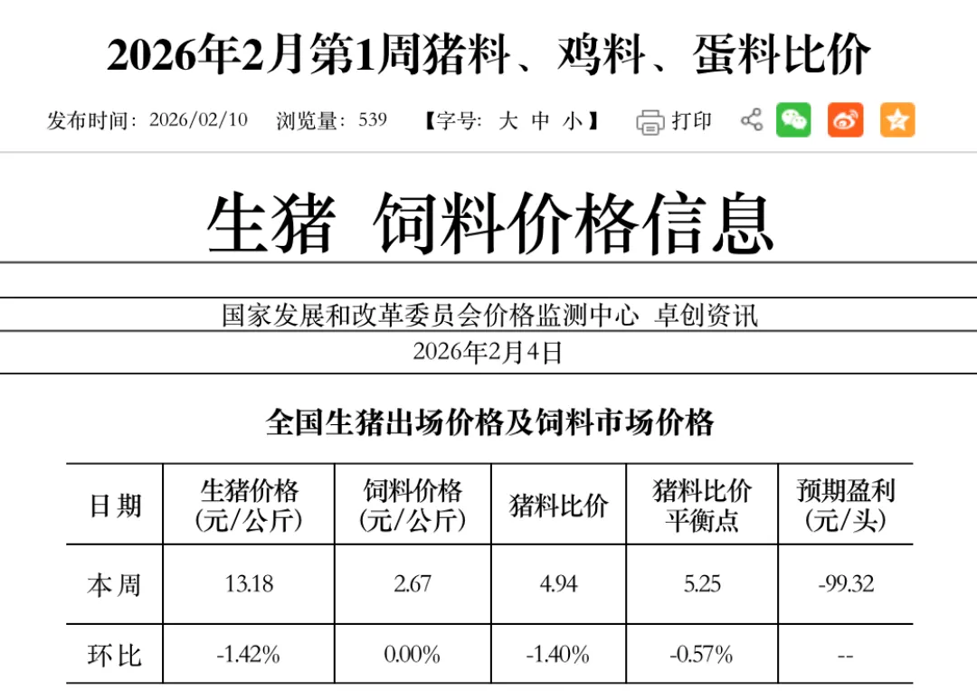 本周全国猪料比价为4.94,环比下跌1.40%。按目前价格及成本推算,未来仔猪育肥模式的生猪养殖头均盈利为-99.32元。本周生猪均价环比下滑。虽然随着春节临近,养殖端有效出栏时间缩短,但对节后行情持看跌心态,出栏积极,供应端集中增量,同时需求端增量幅度不足,供大于求推动生猪价格走低。未来一周,养殖端出栏或保持增量节奏,而需求端或进入节前集中备货期,供需双增,考虑供应端增幅或不及需求端,预计周均价或环比微涨,养殖预期盈利或稍增。 养好猪,才有钱赚!