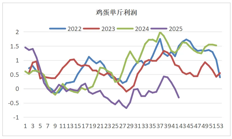 当前鸡蛋产业利润状况持续恶化,鸡蛋周度单斤饲料成本为2.92元,较前期下跌0.02元,成本端虽有小幅缓解,但未能扭转盈利颓势。鸡蛋周度单斤利润为-0.31元,利润水平较前期缩小0.3元,亏损幅度进一步扩大,养殖户对长期盈利前景信心不足,持续亏损下,养殖端资金压力逐步加大,补栏意愿受到显著抑制。