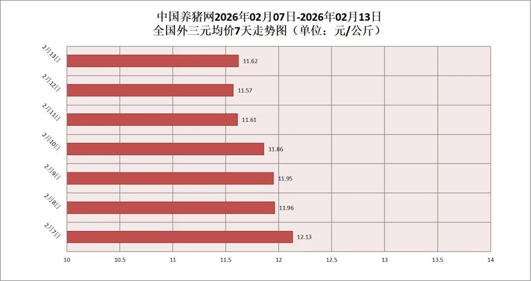 2026年02月13日(星期五),据中国养猪网猪价系统监测,全国外三元均价为11.57元/公斤,猪价较昨日(11.57元/公斤)上涨0.05元/公斤,较上月(12.73元/公斤)下跌了1.16元/公斤。