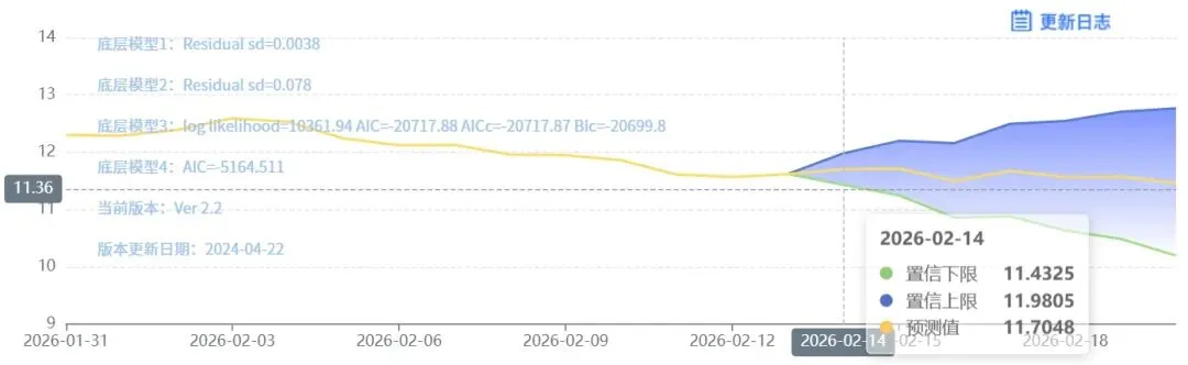 玄田算法是由项目课题组团队原创的非经典逻辑数值聚合理论和不确定性预测方法,构建了基于一致模算子的生猪价格预测模型。该模型采用的聚合函数及一致模相关理论与方法已获得多项国家自然科学基金和省级自然科学资金资助,并获得多项省级自然科学奖奖项。02月14日预测猪价为11.4884,置信区间在11.0202--11.9574之间。02月15日预测猪价为11.4456;02月16日预测猪价为11.4375。