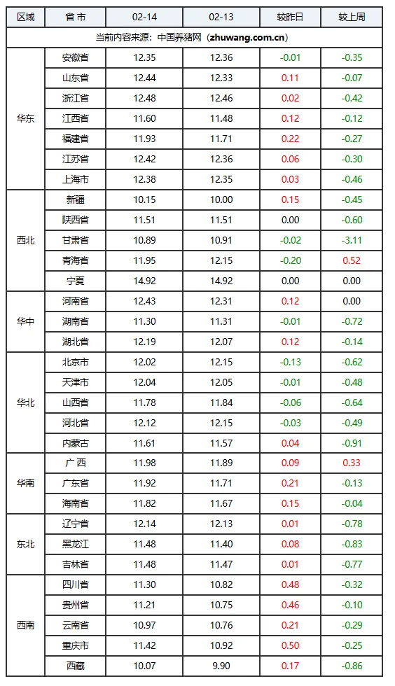 猪价上涨地区(8个):江西省、福建省、河南省、湖北省、内蒙古自治区、广东省、海南省、贵州省、吉林省、黑龙江省、重庆市、山东省、江苏省、辽宁省、西藏自治区、云南省、浙江省、四川省、新疆维吾尔自治区、上海市、广西壮族自治区;上涨区间:0.01-0.50元/公斤; 猪价持平地区(2个):陕西省、宁夏回族自治区; 猪价下跌地区(21个):安徽省、甘肃省、青海省、湖南省、北京市、天津市、山西省、河北省;下跌区间:0.01-0.20元/公斤; 2026年02月15日-中国养猪网 玄田算法预测明日猪价