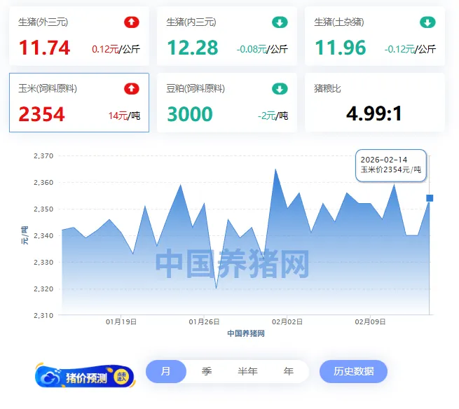 2026年02月14日-中国养猪网 全国玉米价格走势图及涨跌表
