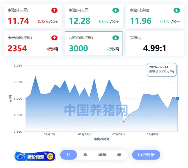 2026年02月14日-中国养猪网 全国豆粕价格走势图及涨跌表
