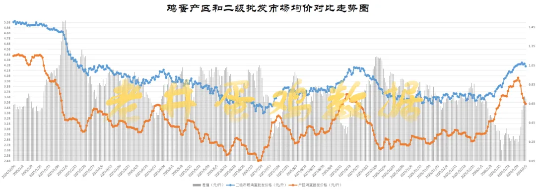 ? 上图中,2025年春节前后(左边),虽然春节前产区蛋价跌势凌厉,但二级市场持续处于高位,产区和批发市场的价差巨大。