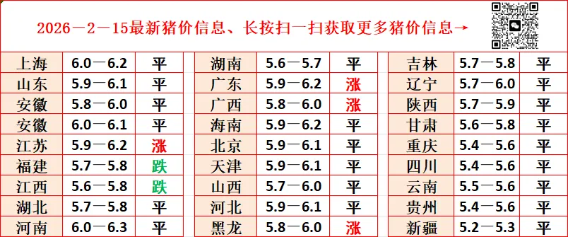 2026.2.15-明日猪价(最新猪价已更新!!) 养羊网 2026-02-14 2026.2.15-明日猪价(最新猪价已更新!!) 养羊网 2026-02-14 上一篇:今日猪价|明天猪价分析2026.2.15 下一篇:明天猪价2月15日 您可能还会对下面的文章感兴趣111: 相关文章 2026 年春节前后猪价、鸡蛋价、菜价走势分析与展望 近期价格更新!!! 2025年4月13日全国各地生猪价格信息 2026年01月16日早间鸡蛋价格参考价