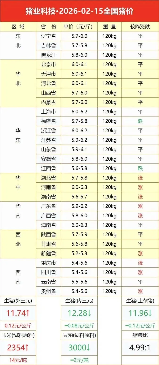 2025年2月15日全国猪价 养羊网 2026-02-14 2025年2月15日全国猪价 养羊网 2026-02-14 上一篇:2月15日 全国猪价早知道! 下一篇:猪价大预测】2月16-2月19日 全国猪价大预 您可能还会对下面的文章感兴趣111: 相关文章 近期价格更新!!! 近期价格更新!!! 2026年1月31日全国鸡蛋价格汇总(参考) 生猪行业大地震!国家三连重拳出击