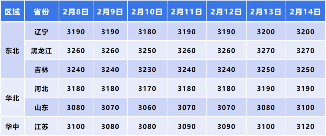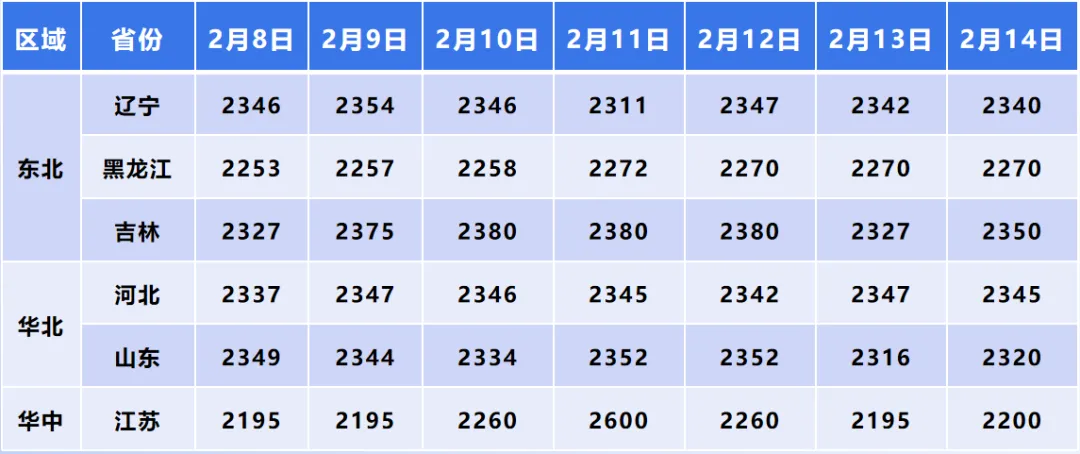 辽宁价格在 2311-2354 元 / 吨区间窄幅震荡,整体偏稳;黑龙江价格从 2253 元 / 吨逐步抬升至 2270 元 / 吨后企稳,走势平稳;吉林价格在 2327-2380 元 / 吨区间波动,先升后稳,月末略有回落。