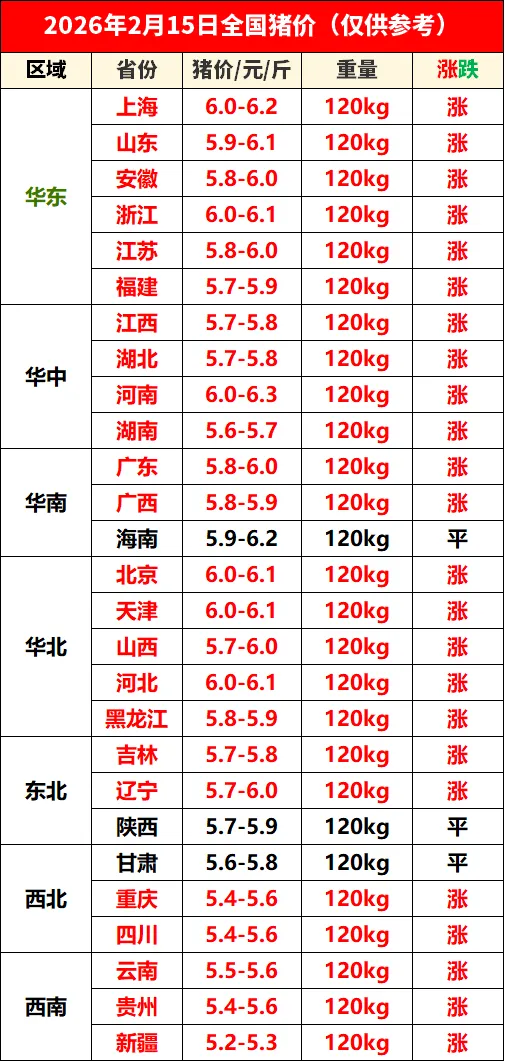 2月15日全国猪价涨,涨,涨,上涨“节节高”! 养羊网 2026-02-15 2月15日全国猪价涨,涨,涨,上涨“节节高”! 养羊网 2026-02-15 上一篇:明日(2月16日)鸡蛋价格预测 下一篇:今日鸡蛋价格行情(2026年02月15日) 您可能还会对下面的文章感兴趣111: 相关文章 【明天猪价】2026.1.30日全国猪价(已更新!) 开奶茶店赚钱吗 投资奶茶店应慎重 2025年4月13日全国各地生猪价格信息 2025年4月13日全国各地生猪价格信息