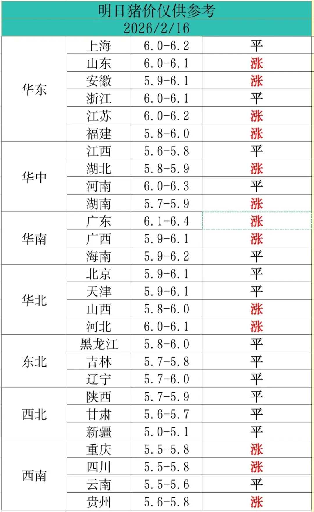 2026年2月16日全国猪价信息/供大家参考 养羊网 2026-02-15 2026年2月16日全国猪价信息/供大家参考 养羊网 2026-02-15 上一篇:2026.02.16-明天猪价( 辞旧迎新!祝猪价步步高升!!!) 下一篇:明天猪价2026年2月16日 您可能还会对下面的文章感兴趣111: 相关文章 美国禽流感引发的鸡蛋断缺 明日猪价——2026年2月06全国生猪价格! 近期价格更新!!! 0206-全国鸡蛋价格综合报价