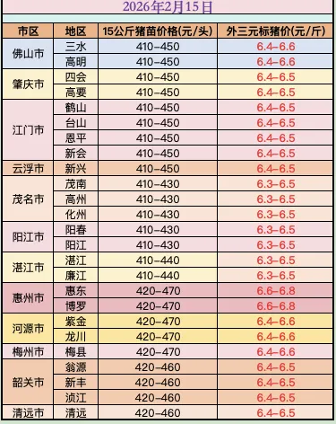 2月15日猪价速递 养羊网 2026-02-15 2月15日猪价速递广东猪苗全省各地报410~470元起,毛猪报6.3~6.8元,全省各地区都升价。年关行情已启动,节奏瞬息,踏准步伐。(行情仅供参考) 养羊网 2026-02-15 上一篇:【明天猪价】2026.2.16全国猪价已更新) 下一篇:2026.02.16-明天猪价(猪价上涨现象增多!) 您可能还会对下面的文章感兴趣111: 相关文章 近期价格更新!!! 不少养羊户认知当中,种羊肯定是越大越好! 线上养羊,想体验一下吗? 宝鸡育肥猪价格