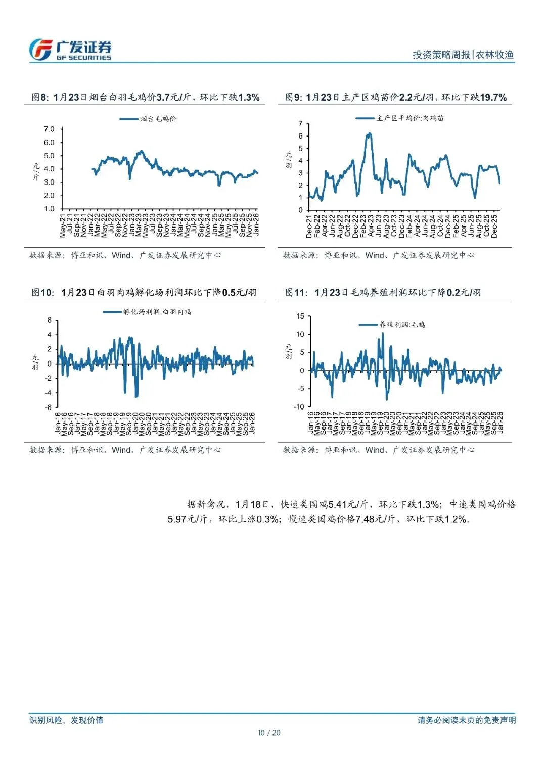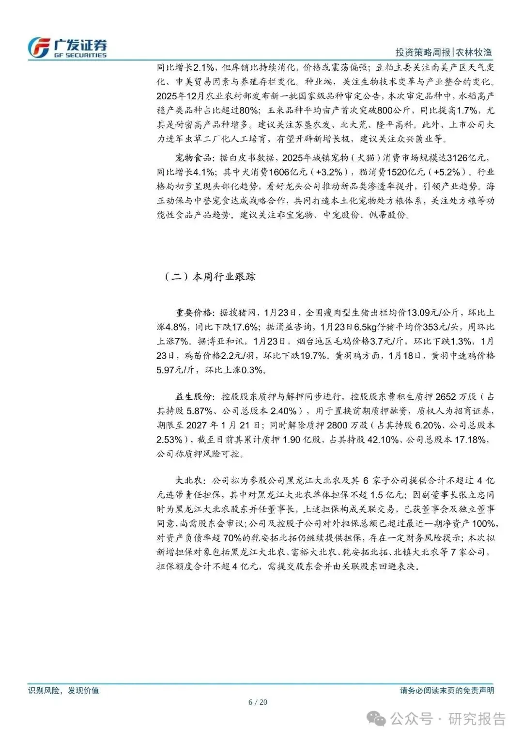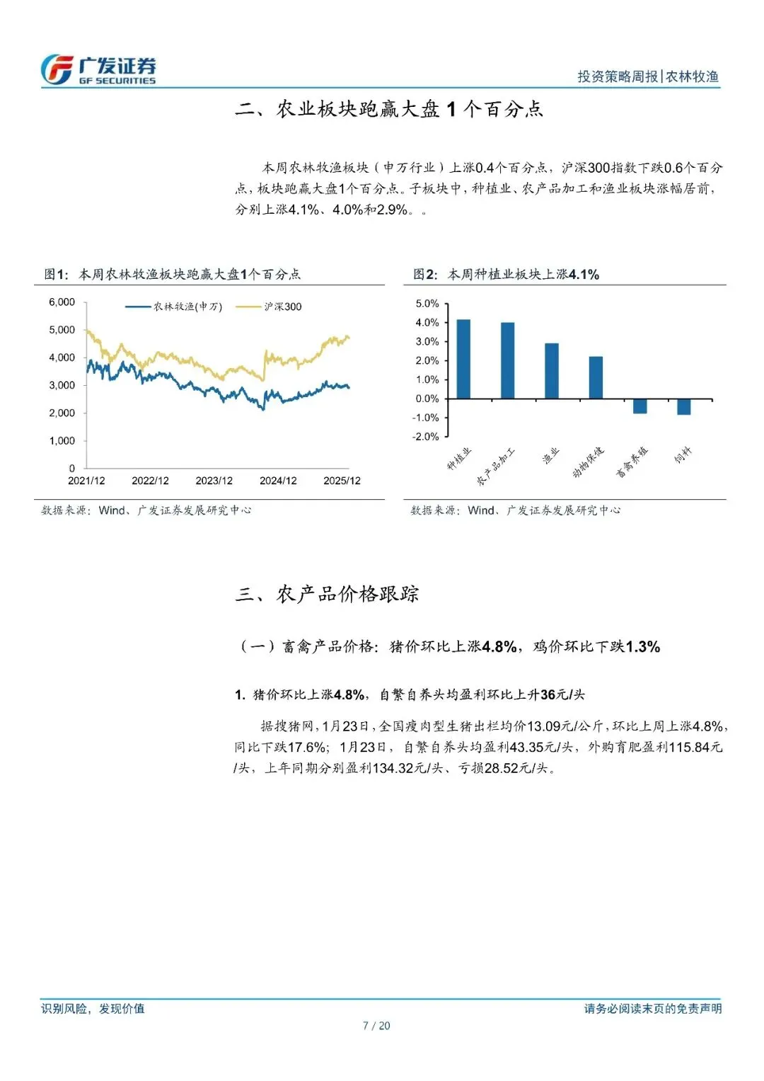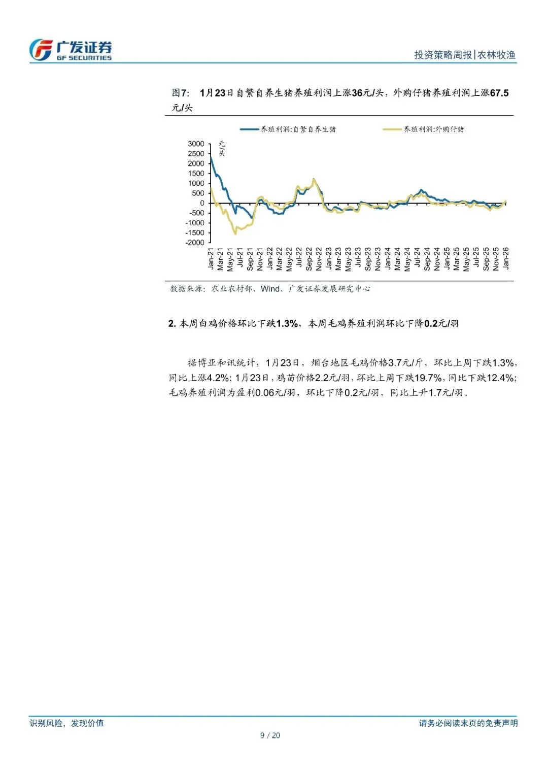 畜禽养殖:据搜猪网,1?月?23?日,全国瘦肉型生猪出栏均价?13.09?元/公斤,环比上涨?4.8%,同比下跌?17.6%。消费旺季猪价延续反弹,行业重新步入盈利区间,据博亚和讯数据,自繁自养头均盈利约?40?元。仔猪价格方面,据涌益咨询数据,目前?6.5kg?仔猪均价上涨至?353?元/头,周环比上涨?7%。近期仔猪价格快速反弹,或侧面反映养殖户看好下半年猪价、补栏积极性提升。行业进入“拉锯”状态,具备成本优势的企业具有显著的竞争优势。