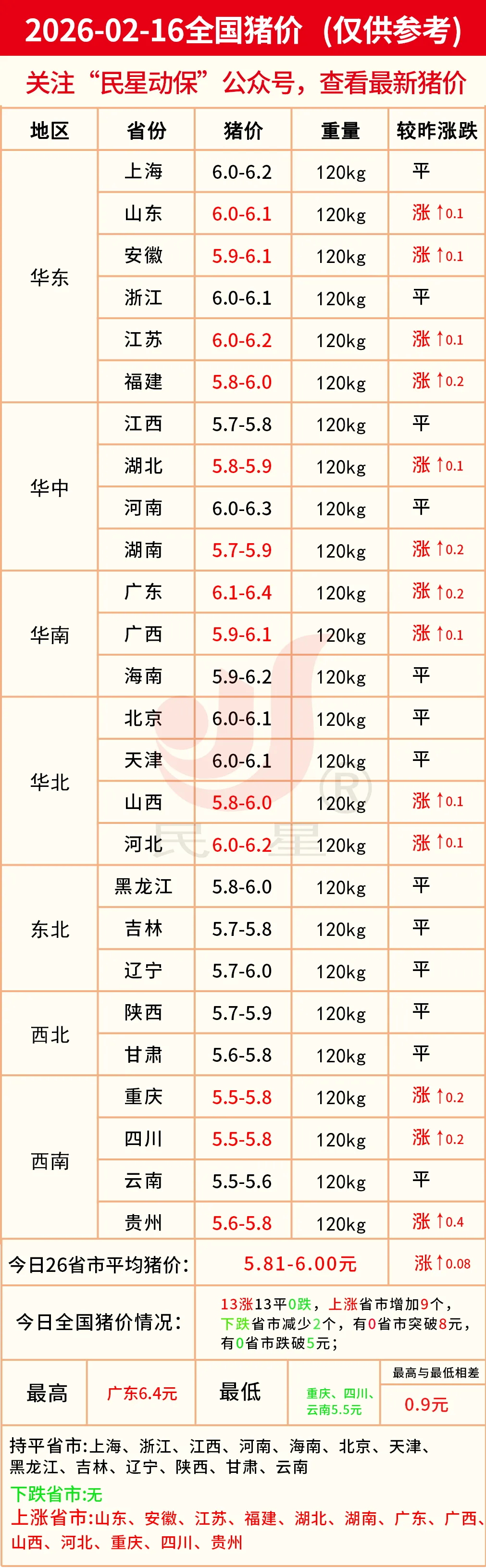 明日猪价—2026年02月16日(全国最新生猪价格) 养羊网 2026-02-15 明日猪价—2026年02月16日(全国最新生猪价格) 养羊网 2026-02-15 上一篇:猪粮比进入过度下跌一级预警区间,猪价被严重低估,或止跌回稳! 下一篇:明日猪价——2026年2月16全国生猪价格! 您可能还会对下面的文章感兴趣111: 相关文章 现在哪里有只吃粮食长大的猪 小羊最新观点:国庆利好板块排行榜! 自存|新疆乌鲁木齐 2025年4月13日全国各地生猪价格信息