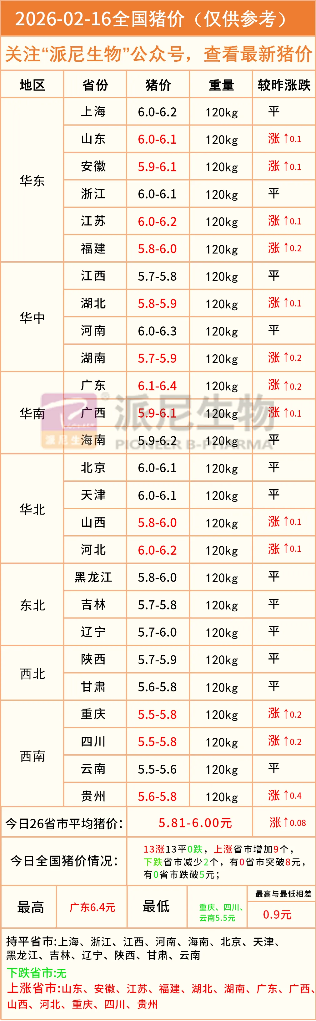 明日猪价——2026年2月16日全国生猪价格! 养羊网 2026-02-15 明日猪价——2026年2月16日全国生猪价格! 养羊网 2026-02-15 上一篇:明日猪价——2026年2月16全国生猪价格! 下一篇:明日猪价【2026年2月16日】全国猪价来啦! 您可能还会对下面的文章感兴趣111: 相关文章 近期价格更新!!! 安徽亳州芮志才动脑制棉被轻松赚钱 2026年1月9日 全国鸡蛋价格以稳为主! 2月9日云南昆明鸡蛋价格参考