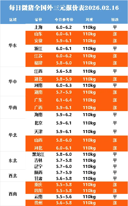 明日最新猪价2026.02.16点击蓝字关注 猪价不错过