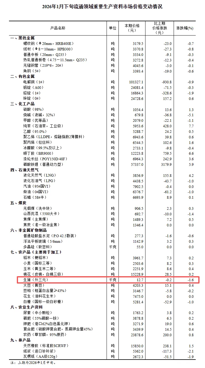 最新国家统计局公布的数据显示,1月下旬全国外三元生猪价格为12.7元/公斤,较中旬下跌1.6%;同期农业农村部畜牧兽医局监测的生猪定点屠宰企业收购均价为14.06元/公斤,环比下降0.4%,同比下降20.2%。