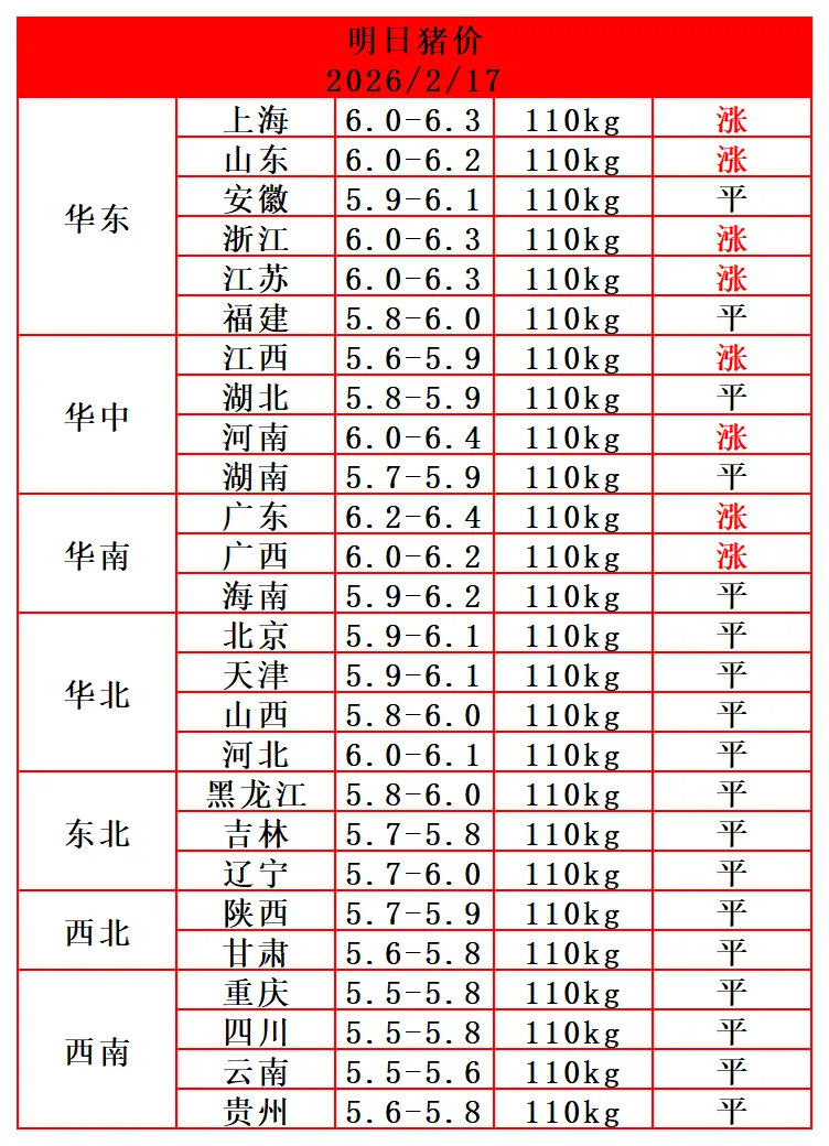 2026.2.17-明日猪价(祝大家新年快乐!) 养羊网 2026-02-16 2026.2.17-明日猪价(祝大家新年快乐!) 养羊网 2026-02-16 上一篇:【猪价预测】2月18-2月21日 猪价预测 下一篇:【超前猪价】2月18-2月21日 猪价预测 您可能还会对下面的文章感兴趣111: 相关文章 内蒙羊都不明码标价的吗? 成都一日游之青羊宫 趣玩儿羊圈 近期价格更新!!!