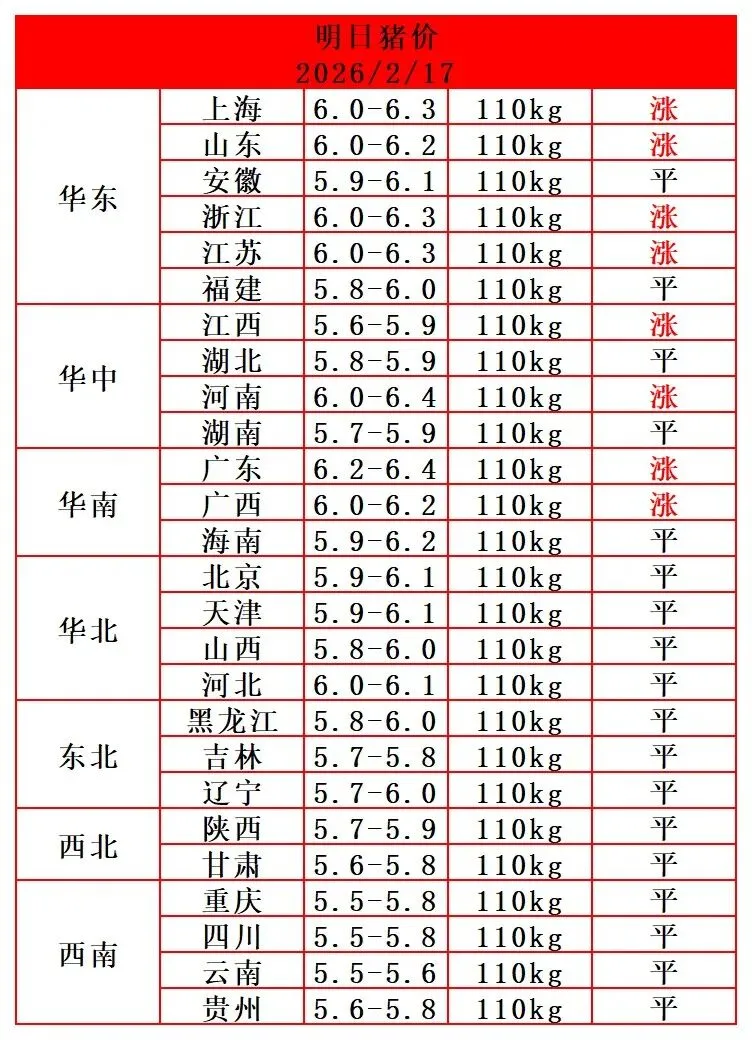 2026.2.17-明日猪价(祝大家新春快乐!马年行大运!) 养羊网 2026-02-16 2026.2.17-明日猪价(祝大家新春快乐!马年行大运!)关注:云南猪价网,最新猪价早知道!小编不需要大家打赏,只希望您在文末点个“在看” 养羊网 2026-02-16 上一篇:马上发财!涨!涨!涨!2.17明日猪价早知道,2.17全国最新猪价信息 下一篇:【超前猪价大预测】2月19日~2月22日!全国猪价! 您可能还会对下面的文章感兴趣111: 相关文章 近期价格更新!!! 4月28日牛肉、羊肉价格 今夜交大夜市!gogogo,出发咯~ 2025年4月13日全国各地生猪价格信息