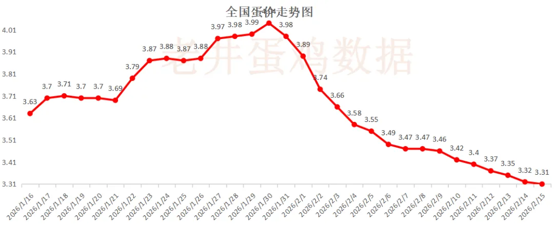 老井扯鸡蛋:昨日全国鸡蛋均价、淘汰鸡均价均偏弱!根据老井报价数据平台,统计结果显示:昨天, 鸡蛋全国均价3.31元/斤,较前日减0.01元/斤,减幅0.3%!