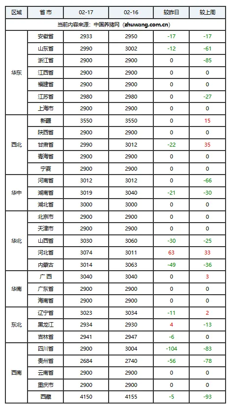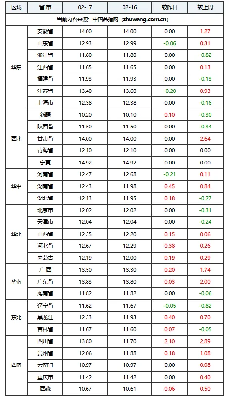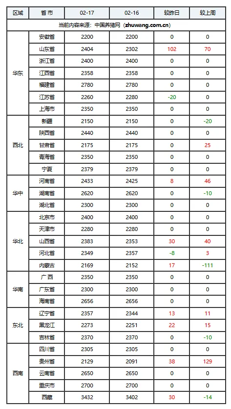 02月17日猪价:今日猪价全线上涨!全国南强北稳,多地再冲高!