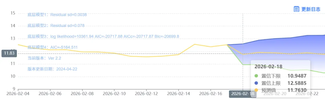 玄田算法是由项目课题组团队原创的非经典逻辑数值聚合理论和不确定性预测方法,构建了基于一致模算子的生猪价格预测模型。该模型采用的聚合函数及一致模相关理论与方法已获得多项国家自然科学基金和省级自然科学资金资助,并获得多项省级自然科学奖奖项。02月18日预测猪价为11.7630,置信区间在10.9487--12.5885之间。02月19日预测猪价为11.9146;02月20日预测猪价为11.8845。