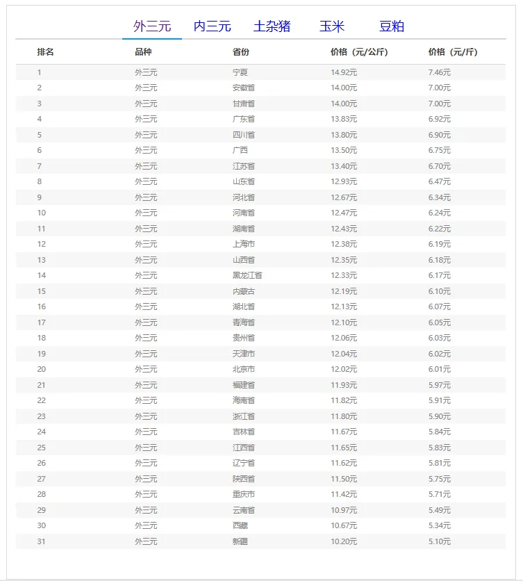 全国外三元生猪价格排行榜