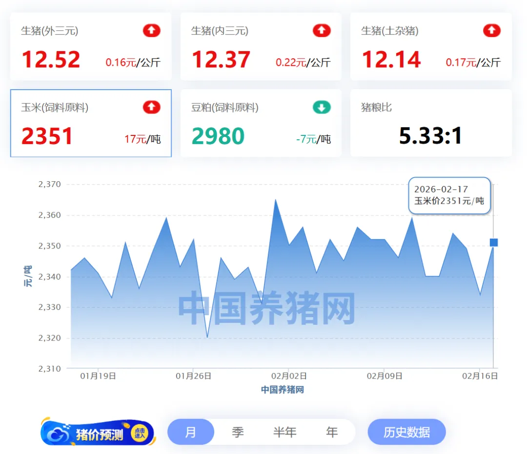 2026年02月17日-中国养猪网 全国玉米价格走势图及涨跌表