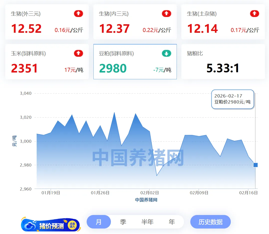 2026年02月17日-中国养猪网 全国豆粕价格走势图及涨跌表