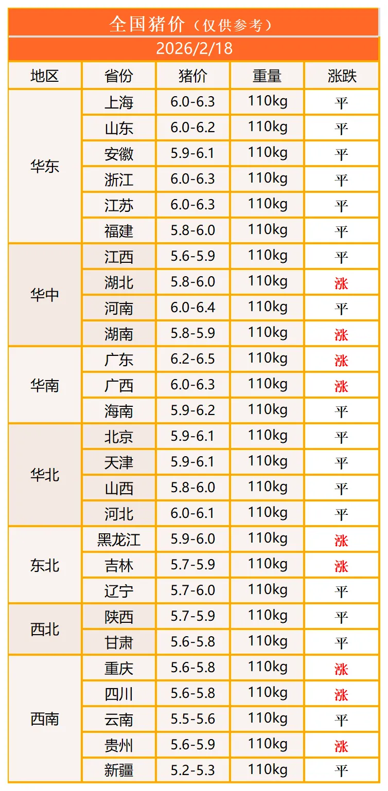 明日猪价2026年2月18日猪价信息 养羊网 2026-02-17 明日猪价2026年2月18日猪价信息图中二维码 >添加关注领异标新 鲜声夺人多用心 同分享长按指纹 >识别 养羊网 2026-02-17 上一篇:2026-02-17今日猪价 下一篇:【猪价早报】2026.2.18全国猪价全面上涨 您可能还会对下面的文章感兴趣111: 相关文章 谁吃谁知道 乌鲁木齐买羊肉带走 2025年4月13日全国各地生猪价格信息 星露谷标准农场布局