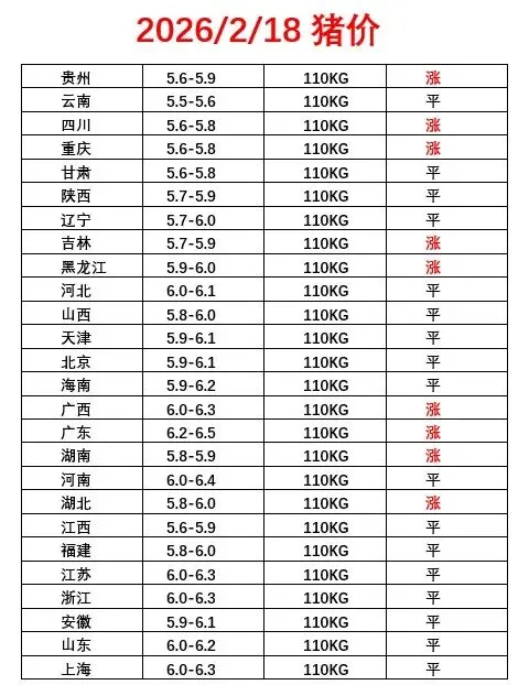 2026.2.18猪价出来了 养羊网 2026-02-17 2026.2.18猪价出来了 养羊网 2026-02-17 上一篇:【生猪价格】2026.2.17——初一猪价(飘红了) 下一篇:【科普大讲堂】红皮鸡蛋比白皮鸡蛋营养价值更高? 您可能还会对下面的文章感兴趣111: 相关文章 冰岛羊肉 天康鸡蛋真的是很难吃 近期价格更新!!! 梦想城镇?农家小院第二弹