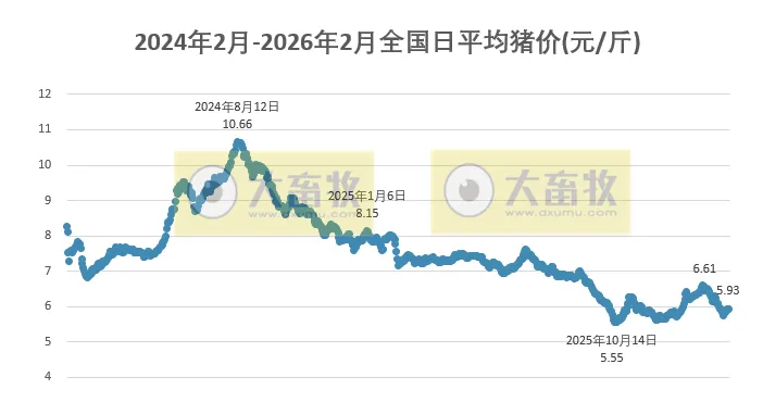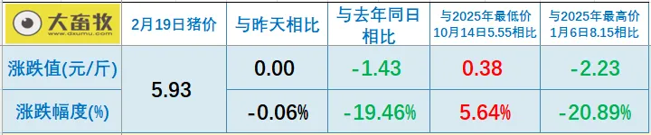 大畜牧小编根据我国27省的猪价数据,计算出2026年2月19日全国平均猪价为每斤5.93元,与昨天持平;