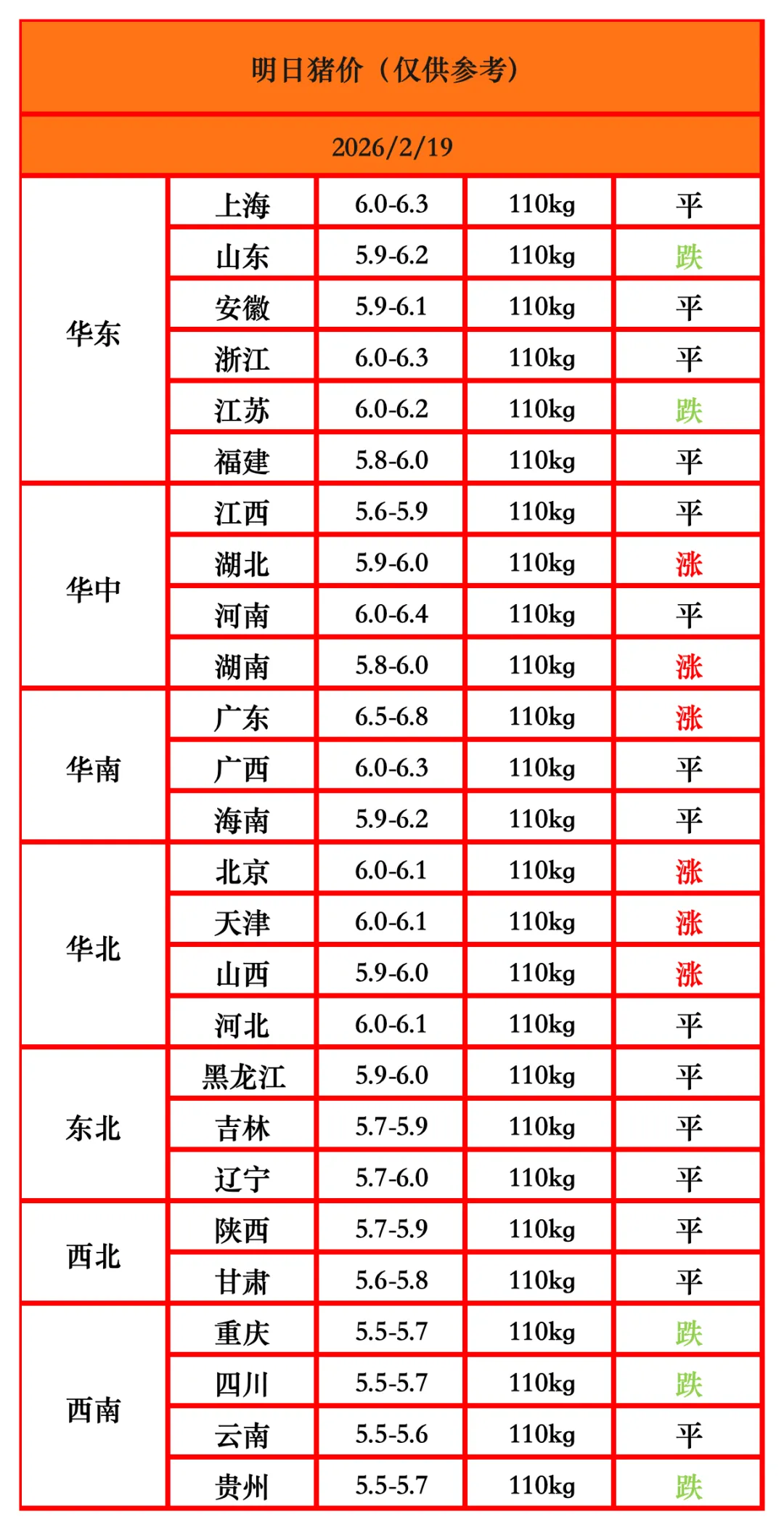 【明日猪价】跌涨互现,局部飘红! 养羊网 2026-02-18 【明日猪价】跌涨互现,局部飘红!猪价点评整体来看,全国生猪价格呈现下跌的态势,上涨地区:新疆、湖北、山西、广东、辽宁、黑龙江等地猪价小幅上涨,涨幅在0.10-0.93元/公斤,主要受局部需求支撑或养殖端惜售影响。下跌地区:山东、江苏、河南、湖南、四川等省份猪价下跌,跌幅在0.06-1.50元/公斤,反映供应压力较大的区域价格调整明显。持平地区:安徽、浙江、江西、上海等多地猪价保持稳定,显示市场在部分区域仍有一定韧性。(来源网络)往期回顾晒环保手册,赢新年礼物~喜报!扬翔杜洛克种公猪斩获全国种猪大赛第一名!排名前十!生猪国家核心育种场季度遗传评估报告,扬翔种猪多项数据表现优异 养羊网 2026-02-18 上一篇:2026.2.18河北馆陶鸡蛋报价 下一篇:重磅!春节猪价大涨预期落空?屠宰不停工,养猪人别再赌行情! 您可能还会对下面的文章感兴趣111: 相关文章 近期价格更新!!! 2026年1月13日 ?全国最新鸡蛋价格行情? 鸡蛋价几分动,餐桌经济大不同 近期价格更新!!!