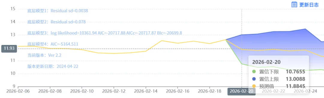 玄田算法是由项目课题组团队原创的非经典逻辑数值聚合理论和不确定性预测方法,构建了基于一致模算子的生猪价格预测模型。该模型采用的聚合函数及一致模相关理论与方法已获得多项国家自然科学基金和省级自然科学资金资助,并获得多项省级自然科学奖奖项。02月20日预测猪价为11.8845,置信区间在10.7655--13.0088之间。02月21日预测猪价为11.7938;02月22日预测猪价为11.8866。