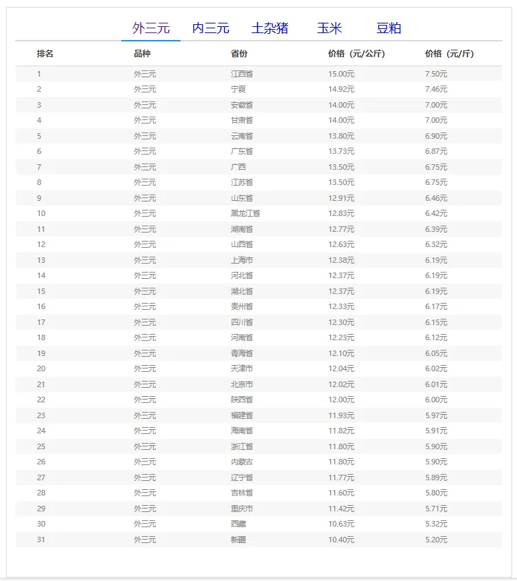 全国外三元生猪价格排行榜