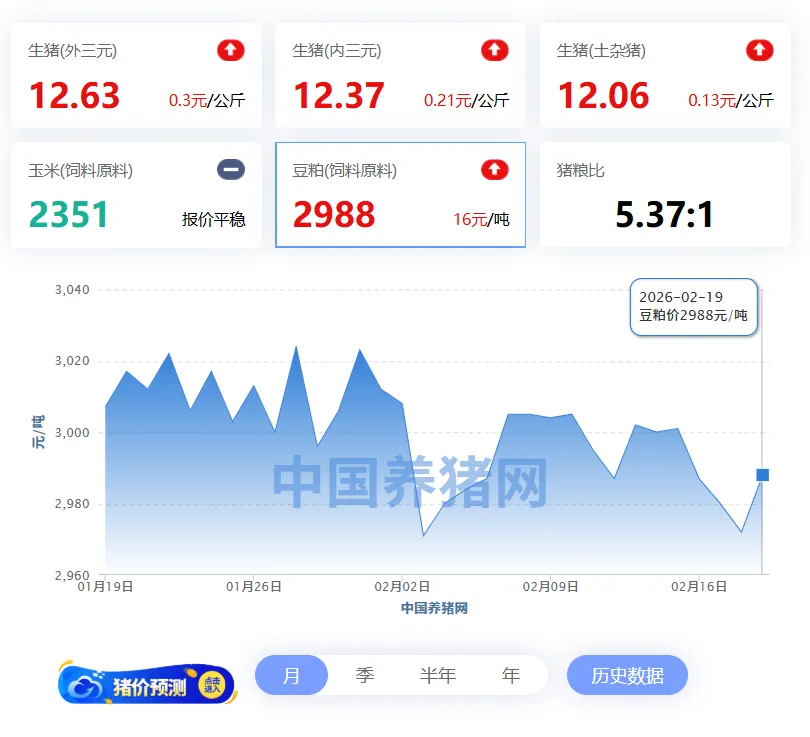 2026年02月19日-中国养猪网 全国豆粕价格走势图及涨跌表