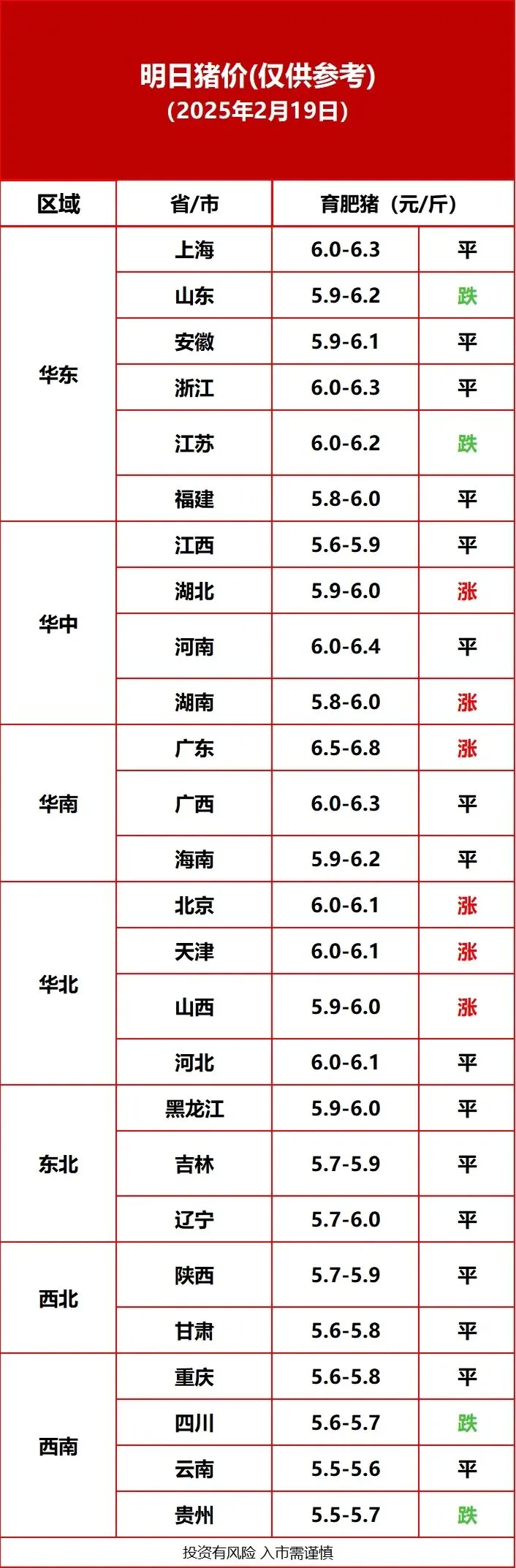 【今日猪价】2月19日全国猪价:部分地区价格调整,市场需求相对稳定 养羊网 2026-02-19 【今日猪价】2月19日全国猪价:部分地区价格调整,市场需求相对稳定 养羊网 2026-02-19 上一篇:【猪价大预测】2月19日~2月21日!全国猪价! 下一篇:全国猪价进入分化调整期,华南强势支撑市场! 您可能还会对下面的文章感兴趣111: 相关文章 养羊人,最好把这些背下来!都是经典 2月4日:北弱南强!全国猪价涨跌互现,陕西最高跌0.12元/斤,广西0.08元/斤领涨【新猪派· 近期价格更新!!! 2025年4月13日全国各地生猪价格信息