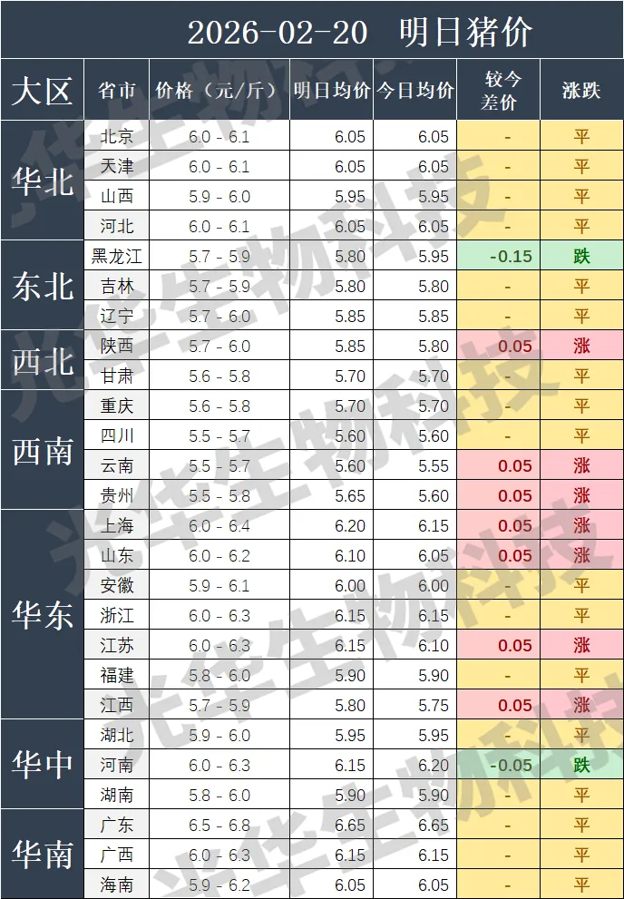 2026-2- 20全国猪价预测 养羊网 2026-02-19 2026-2- 20全国猪价预测----- 养羊网 2026-02-19 上一篇:2026.2.20-明天猪价(一夜升温!多地上涨!养猪户卖猪意愿低!) 下一篇:【明天猪价】 2026.2.20日全国猪价 您可能还会对下面的文章感兴趣111: 相关文章 河南物价才是真的低! 犊牛、羔羊饲养三大关键点 五谷鸡蛋是不是都土鸡蛋 2025年4月13日全国各地生猪价格信息