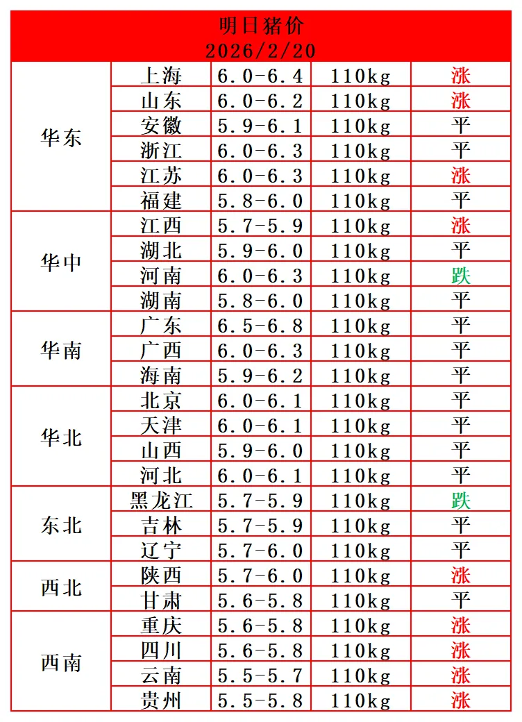 2026.2.20-今日最新猪价(西南强势反弹,猪价又上涨了!) 养羊网 2026-02-20 2026.2.20-今日最新猪价(西南强势反弹,猪价又上涨了!) 养羊网 2026-02-20 上一篇:今日猪价 | 多地持续上涨,整体企稳! 下一篇:今日猪价|明天猪价分析2026.2.20 您可能还会对下面的文章感兴趣111: 相关文章 2026年1月17日最新鸡蛋价格 2025年4月13日全国各地生猪价格信息 自家散养的土鸡蛋 近期价格更新!!!
