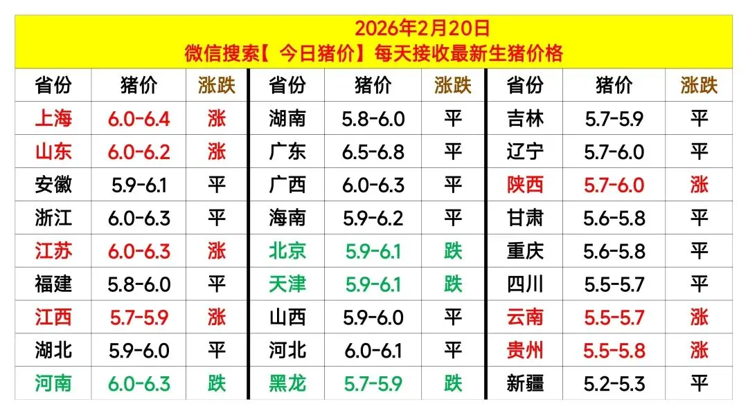 今日猪价|明天猪价分析2026.2.20 养羊网 2026-02-20 今日猪价|明天猪价分析2026.2.20关注我们,早点知道猪价 养羊网 2026-02-20 上一篇:2026.2.20-今日最新猪价(西南强势反弹,猪价又上涨了!) 下一篇:猪价年后走势定调:底部有支撑,上涨没动力, 想卖猪的别贪这波行情 您可能还会对下面的文章感兴趣111: 相关文章 第39篇:什么是【猪周期】? 2025年4月13日全国各地生猪价格信息 【明天猪价】2026.2.13企业继续上涨!散户平稳!只供参考 PDD白嫖怪