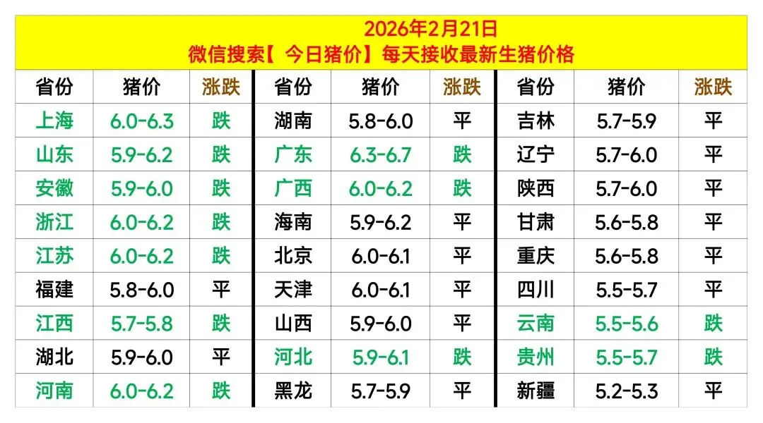 今日猪价|明天猪价分析2026.2.21 养羊网 2026-02-20 今日猪价|明天猪价分析2026.2.21关注我们,早点知道猪价 养羊网 2026-02-20 上一篇:猪价大预测】2月21日~2月23日!全国猪价! 下一篇:猪价有变!2026.2.21全国各地生猪价格早知道! 您可能还会对下面的文章感兴趣111: 相关文章 2016年农村创业五大商机 关于下单及发货时间 近期价格更新!!! 一文弄懂猪猪价格为何大起大落|猪周期