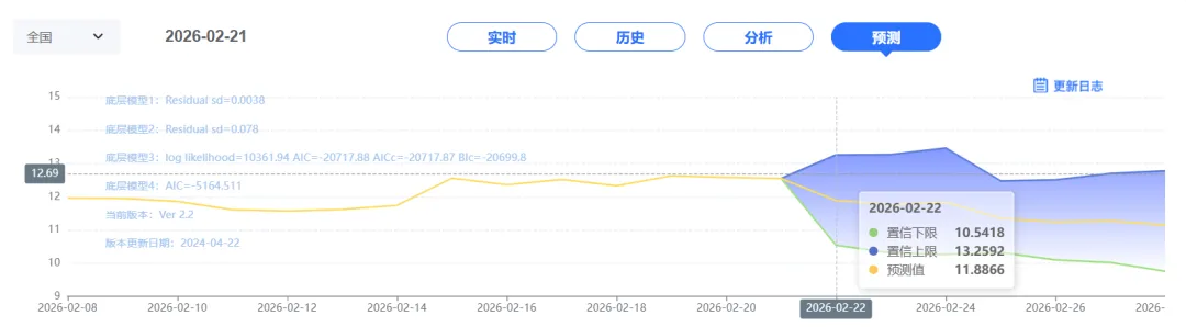 玄田算法是由项目课题组团队原创的非经典逻辑数值聚合理论和不确定性预测方法,构建了基于一致模算子的生猪价格预测模型。该模型采用的聚合函数及一致模相关理论与方法已获得多项国家自然科学基金和省级自然科学资金资助,并获得多项省级自然科学奖奖项。02月22日预测猪价为11.8866,置信区间在10.5418--13.2592之间。02月23日预测猪价为11.7672;02月24日预测猪价为11.8384。